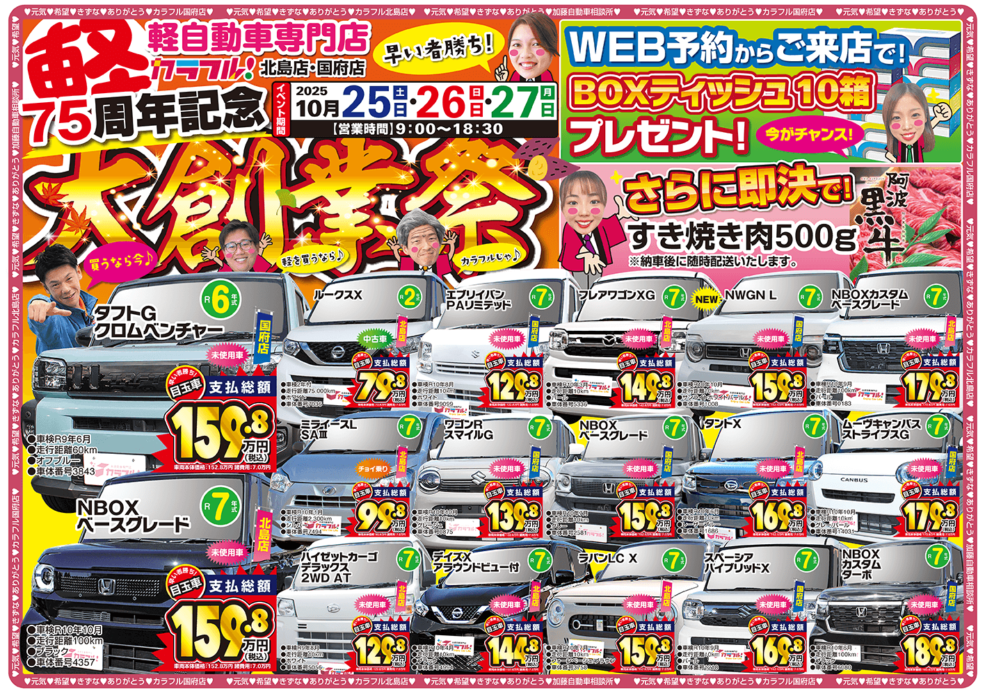 対象はカラフル国府店か北島店での購入車両に限ります。有効期限は購入日から3年以内。保険修理は対象外です。他の割引と併用はできません。