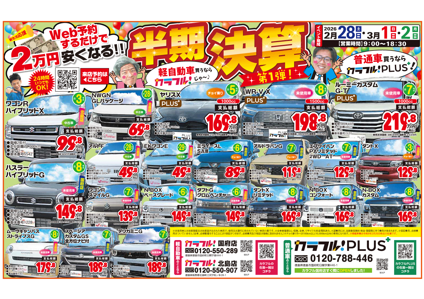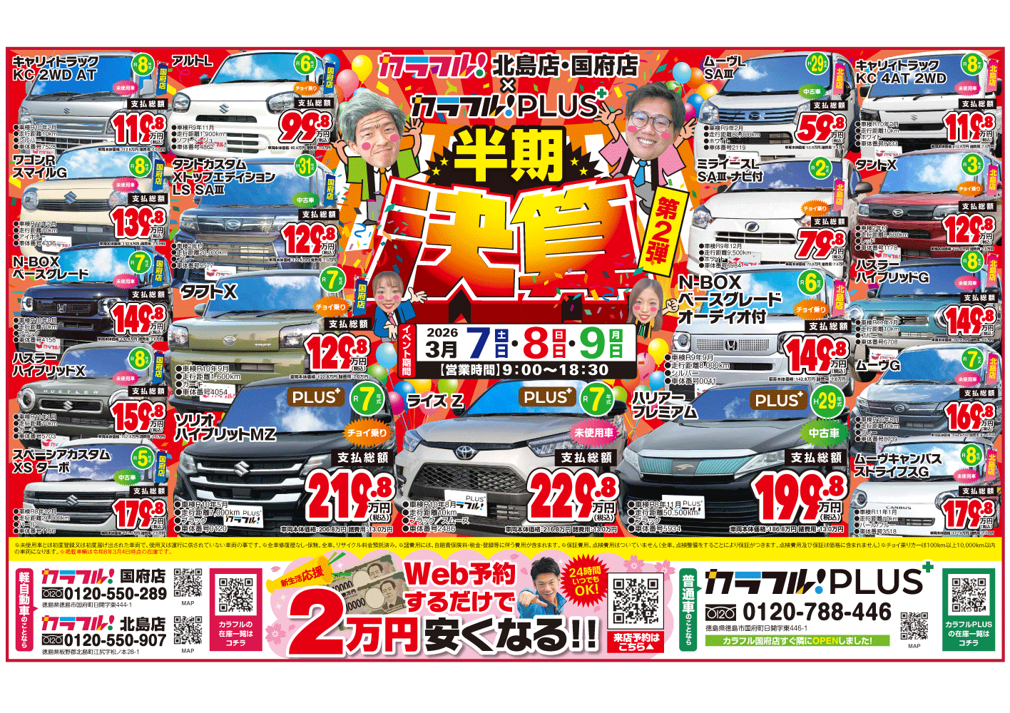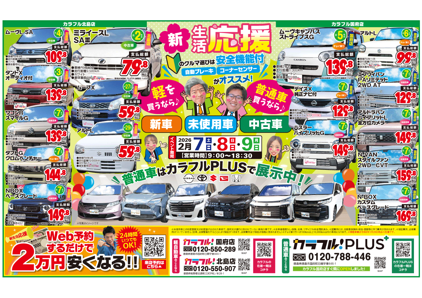 対象はカラフル国府店か北島店での購入車両に限ります。有効期限は購入日から3年以内。保険修理は対象外です。他の割引と併用はできません。