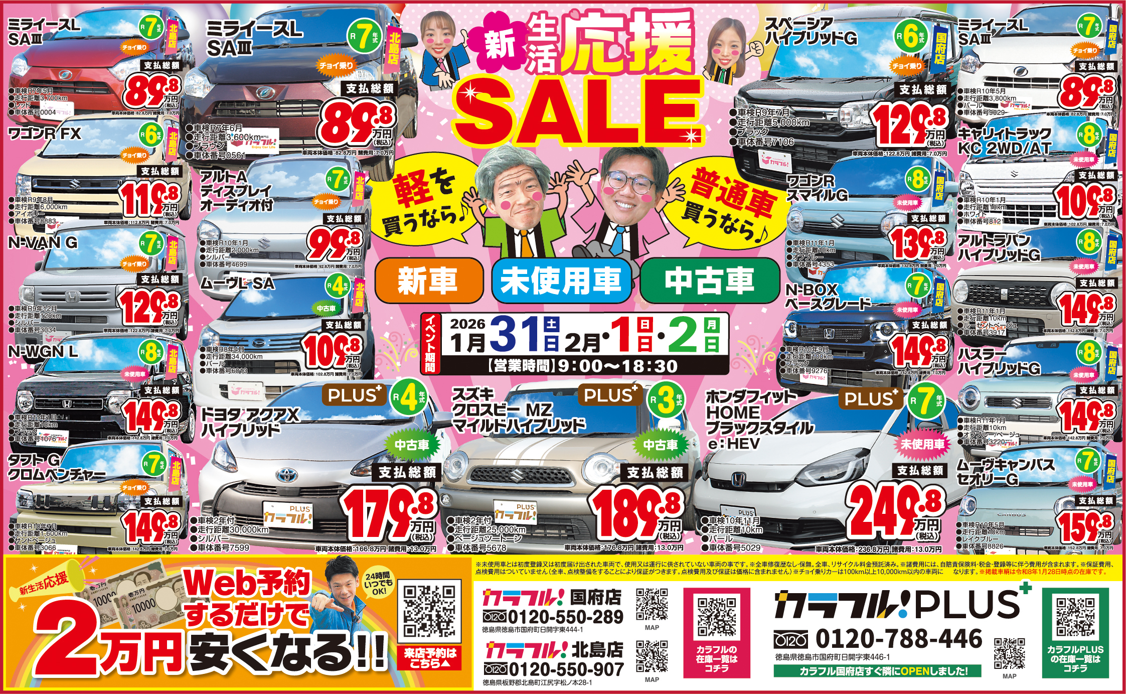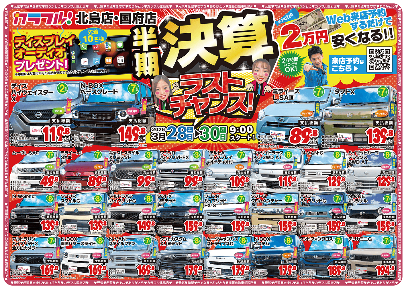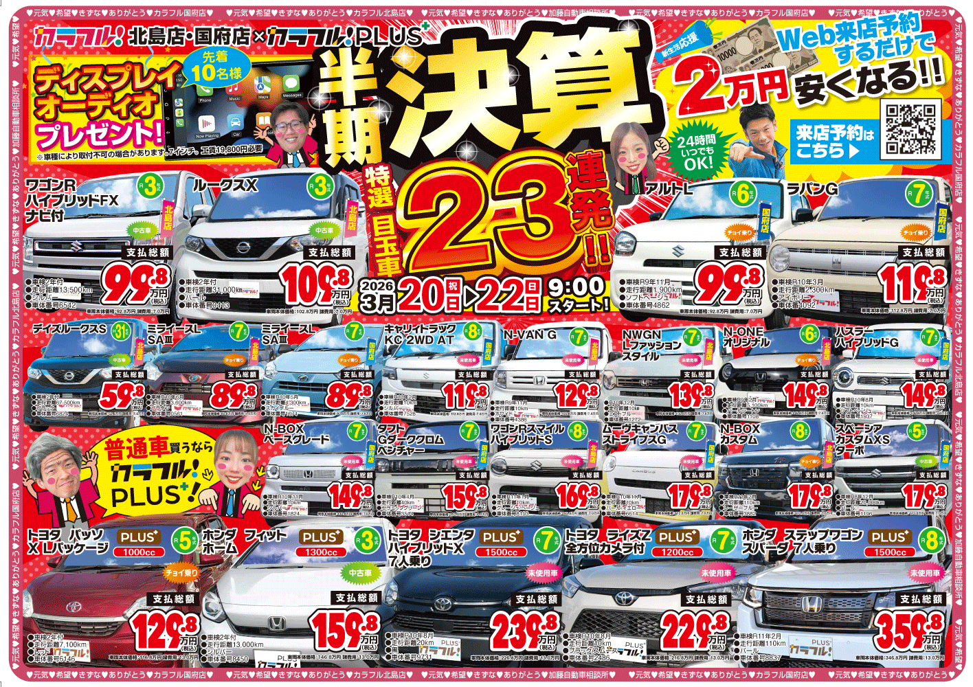 対象はカラフル国府店か北島店での購入車両に限ります。有効期限は購入日から3年以内。保険修理は対象外です。他の割引と併用はできません。