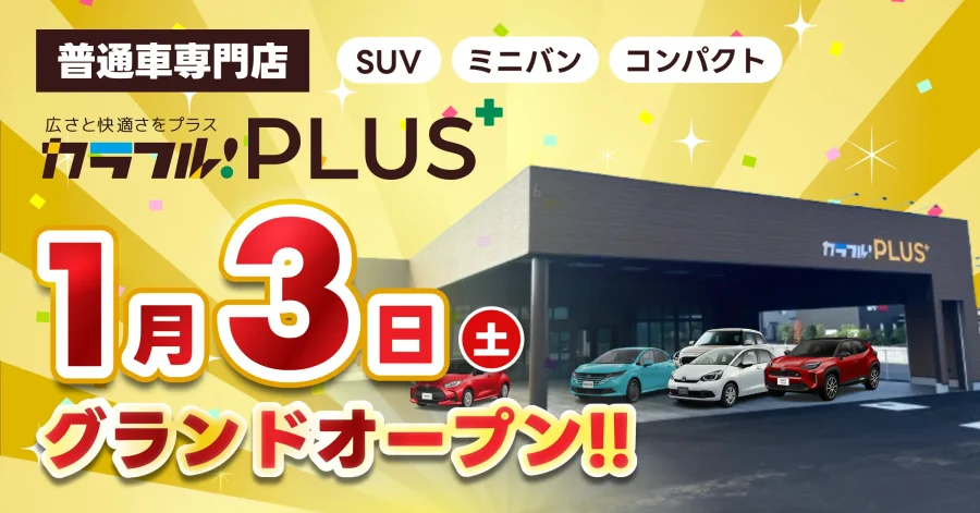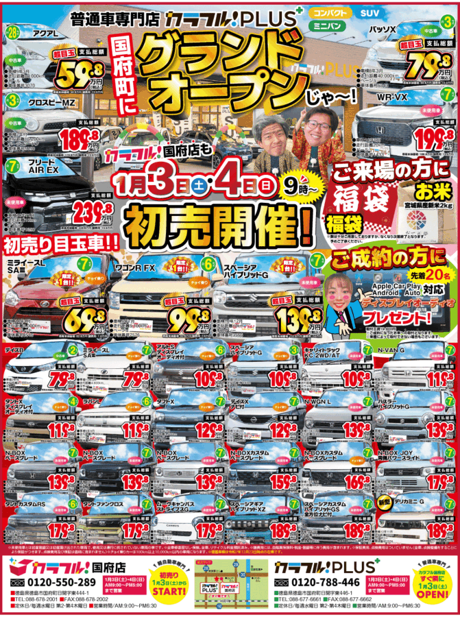 2026年1月3日(祝)朝9時普通車専門店 カラフル!プラス\ グランドオープン!! / さらに同日、カラフル!国府店でも初売りを同時開催! ご来場いただいた方には福袋 & お米をプレゼント! 初売りだけの超!特別価格車を多数ご用意しています。 この機会にしか出会えない一台を、ぜひ店頭で直接ご覧ください! ※1月3日・4日は【WEB予約不可】となりますので、直接ご来場ください。 初売り期間中は【WEB特典以上の特別価格】で販売しています。※来場特典は数量限定のため、なくなり次第終了となります。 カラフル!国府店 ダイハツ ミライース 総額 69.8万円 詳細・在庫確認 カラフル!国府店 ダイハツ ミライース 総額 79.8万円 詳細・在庫確認 カラフル!国府店 ニッサン デイズ 総額 79.8万円 詳細・在庫確認 カラフル!国府店 スズキ ワゴンR 総額 99.8万円 詳細・在庫確認 カラフル!国府店 スズキ キャリートラック 総額 109.8万円 詳細・在庫確認 カラフル!国府店 スズキ アルト 総額 109.8万円 詳細・在庫確認 カラフル!国府店 スズキ スペーシア 総額 109.8万円 詳細・在庫確認 カラフル!国府店 スズキ ラパン 総額 119.8万円 詳細・在庫確認 カラフル!国府店 ホンダ NVAN 総額 119.8万円 詳細・在庫確認 カラフル!国府店 ダイハツ タント 総額 119.8万円 詳細・在庫確認 カラフル!国府店 ニッサン デイズ 総額 129.8万円 詳細・在庫確認 カラフル!国府店 ダイハツ タフト 総額 129.8万円 詳細・在庫確認 カラフル!国府店 ホンダ NBOX 総額 139.8万円 詳細・在庫確認 カラフル!国府店 ホンダ N-WGN 総額 139.8万円 詳細・在庫確認 カラフル!国府店 スズキ スペーシア 総額 139.8万円 詳細・在庫確認 カラフル!国府店 ホンダ NBOX 総額 139.8万円 詳細・在庫確認 カラフル!国府店 ホンダ NBOX 総額 139.8万円 詳細・在庫確認 カラフル!国府店 スズキ ハスラー 総額 139.8万円 詳細・在庫確認 カラフル!国府店 ホンダ NBOXカスタム 総額 159.8万円 詳細・在庫確認 カラフル!国府店 ホンダ NBOX 総額 169.8万円 詳細・在庫確認 カラフル!国府店 ダイハツ ムーヴキャンバス 総額 179.8万円 詳細・在庫確認 カラフル!国府店 ダイハツ タントファンクロス 総額 179.8万円 詳細・在庫確認 カラフル!国府店 ホンダ NBOX 総額 179.8万円 詳細・在庫確認 カラフル!国府店 ダイハツ タントカスタム 総額 179.8万円 詳細・在庫確認 1–24件 (27件中) を表示中1 2 » お客様からの喜びの声もたくさんいただいています! に投稿されました 丸大豆 Trustindex は、レビューの元のソースが Google であることを確認します。 丁寧な対応でした に投稿されました mao Trustindex は、レビューの元のソースが Google であることを確認します。 納車までご丁寧に対応いただきありがとうございました! に投稿されました yui Trustindex は、レビューの元のソースが Google であることを確認します。 納車日の急な変更や、子供達がわちゃわちゃしてご迷惑をお掛けしたにも関わらず、嫌な顔一つせず対応してもらえました。 色々迷ったけどカラフルで購入できて良かったです‼︎ ありがとうございました。 に投稿されました Na Na Trustindex は、レビューの元のソースが Google であることを確認します。 スタッフの皆さんが優しくて、丁寧です。わからない事はわかるまで沢山説明してくれました。初めての新車購入しました!ありがとうございました☺️ に投稿されました 澪芳 Trustindex は、レビューの元のソースが Google であることを確認します。 人生で初めて車を購入させていただきました。車種の選択から始まり、保険の説明やETCのセットアップ等、非常に丁寧にサポートしてくださり、不安なくスムーズに購入できました。 に投稿されました 高友 Trustindex は、レビューの元のソースが Google であることを確認します。 とても親切な対応でこちらで購入して大正解。 軽自動車を購入検討の方、お勧めします。 に投稿されました 和正 Trustindex は、レビューの元のソースが Google であることを確認します。 説明が分かりやすく親切丁寧でした。 に投稿されました info tomioka Trustindex は、レビューの元のソースが Google であることを確認します。 軽自動車を初めてリース契約しました。中古の軽を買ってもトータルコストはそんなに変わらなそうで、お任せしたほうが安心で楽なので、お願いして良かったです! に投稿されました Junko Tomioka Trustindex は、レビューの元のソースが Google であることを確認します。 担当の方が丁寧に対応してくださり、気に入った車を契約することができました。アフターサービスも充実しているので、安心して乗車できるのがとても嬉しいです。 もっと読み込む ご来場いただく際は、ネット予約がお得! ↓来店予約はこちら↓ 北島店へご来店 国府店へご来店 カラフルで新車の購入ならこちら!台数限定の特別低金利キャンペーン開催中! 新車のお問い合わせはこちら このフィールドは空のままにしてください。 必須氏名 必須電話番号 必須メールアドレス 必須どちらの店舗に来店を希望しますか? カラフル国府店カラフル