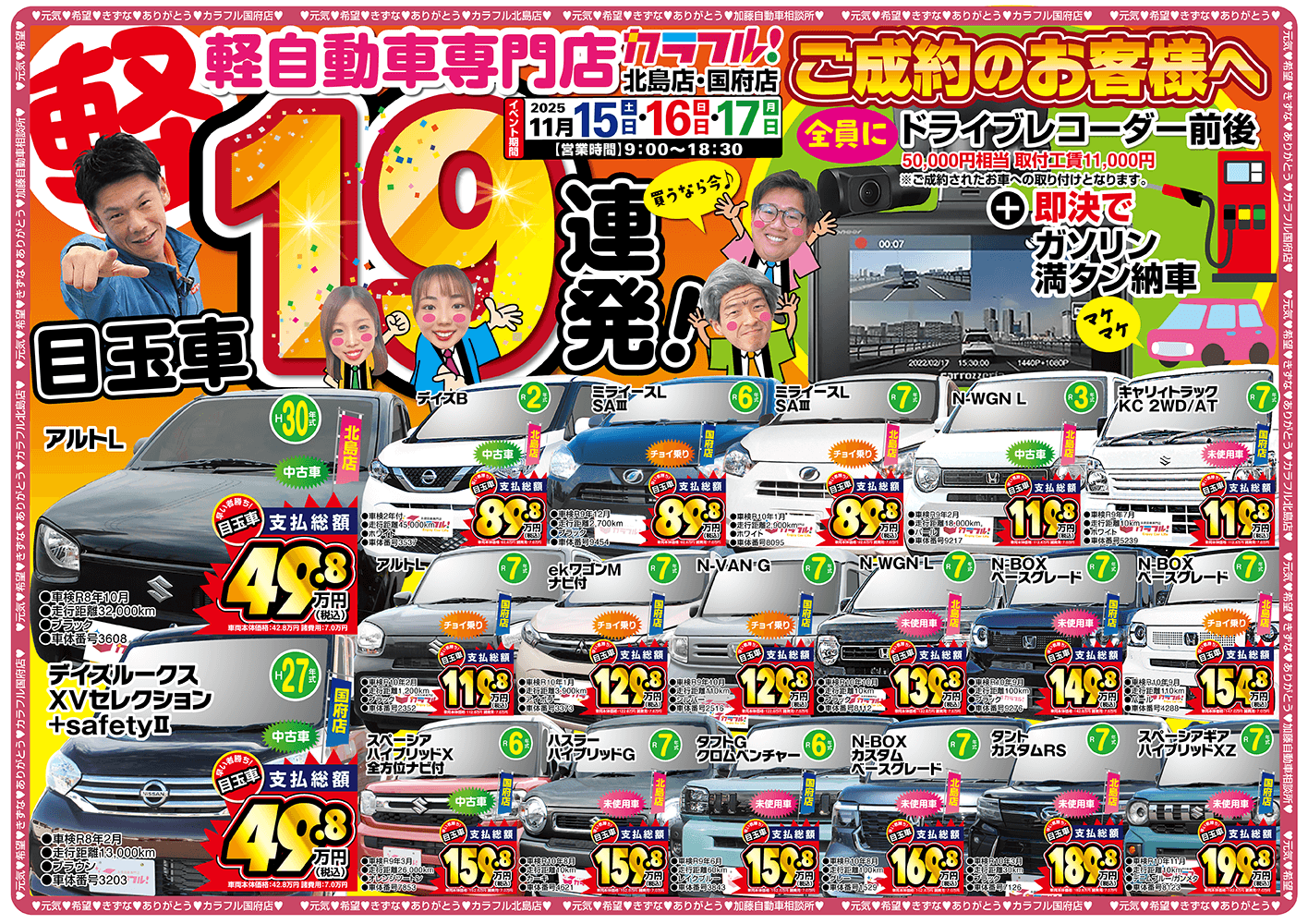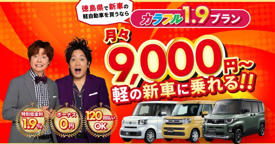 カラフル!国府店 ニッサン デイズルークス 総額 49.8万円 詳細・在庫確認 カラフル!国府店 ダイハツ ミライース 総額 89.8万円 詳細・在庫確認 カラフル!国府店 スズキ キャリートラック 総額 119.8万円 詳細・在庫確認 カラフル!国府店 スズキ アルト 総額 119.8万円 詳細・在庫確認 カラフル!国府店 ホンダ N-VAN 総額 129.8万円 詳細・在庫確認 カラフル!国府店 ミツビシ EKワゴン 総額 129.8万円 詳細・在庫確認 カラフル!国府店 ホンダ N-BOX 総額 149.8万円 詳細・在庫確認 カラフル!国府店 ダイハツ タフト 総額 159.8万円 詳細・在庫確認 カラフル!国府店 スズキ スペーシア 総額 159.8万円 詳細・在庫確認 カラフル!国府店 スズキ スペーシアギア 総額 199.8万円 詳細・在庫確認 お客様からの喜びの声もたくさんいただいています! 丸大豆 Trustindex は、レビューの元のソースが Google であることを確認します。 丁寧な対応でした mao Trustindex は、レビューの元のソースが Google であることを確認します。 納車までご丁寧に対応いただきありがとうございました! yui Trustindex は、レビューの元のソースが Google であることを確認します。 納車日の急な変更や、子供達がわちゃわちゃしてご迷惑をお掛けしたにも関わらず、嫌な顔一つせず対応してもらえました。 色々迷ったけどカラフルで購入できて良かったです‼︎ ありがとうございました。 Na Na Trustindex は、レビューの元のソースが Google であることを確認します。 スタッフの皆さんが優しくて、丁寧です。わからない事はわかるまで沢山説明してくれました。初めての新車購入しました!ありがとうございました☺️ 澪芳 Trustindex は、レビューの元のソースが Google であることを確認します。 人生で初めて車を購入させていただきました。車種の選択から始まり、保険の説明やETCのセットアップ等、非常に丁寧にサポートしてくださり、不安なくスムーズに購入できました。 高友 Trustindex は、レビューの元のソースが Google であることを確認します。 とても親切な対応でこちらで購入して大正解。 軽自動車を購入検討の方、お勧めします。 和正 Trustindex は、レビューの元のソースが Google であることを確認します。 説明が分かりやすく親切丁寧でした。 info tomioka Trustindex は、レビューの元のソースが Google であることを確認します。 軽自動車を初めてリース契約しました。中古の軽を買ってもトータルコストはそんなに変わらなそうで、お任せしたほうが安心で楽なので、お願いして良かったです! Junko Tomioka Trustindex は、レビューの元のソースが Google であることを確認します。 担当の方が丁寧に対応してくださり、気に入った車を契約することができました。アフターサービスも充実しているので、安心して乗車できるのがとても嬉しいです。 ご来場いただく際は、ネット予約がお得! ↓来店予約はこちら↓ 北島店へご来店 国府店へご来店 カラフルで新車の購入ならこちら!台数限定の特別低金利キャンペーン開催中! 新車のお問い合わせはこちら このフィールドは空のままにしてください。 必須氏名 必須電話番号 必須メールアドレス 必須どちらの店舗に来店を希望しますか? カラフル国府店カラフル北島店 必須来店日 ※毎週水曜日と第2第4木曜日が定休日です。 ※当日予約の場合は、電話で予約をお願いいたします。 必須来店時間 9:009:3010:0010:3011:0011:3012:0012:3013:0013:3014:0014:3015:0015:3016:0016:3017:0017:30 任意カラフル!をどこで知りましたか? インターネット検索InstagramFacebookyoutubeTiktok折込チラシポータルサイト(カーリース、グーネット)TVCMその他(知り合いの紹介等) 任意事前にご質問やお問い合わせがあれば、こちらに記載下さい。